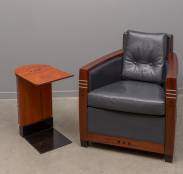 Bubingahouten armfauteuil met zwartlederen bekleding, gezwart houten strips, ebbenhouten en aluminium ornamenten, met bijbehorende bijzettafel met drankcompartiment, serie Decoforma, uitvoering Schuitema -gebruikssporen-, 75 x 72 x 85 cm