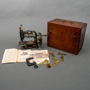 Zwart-goud gelakte handnaaimachine in originele kist met accessoires, uitvoering Louis Beckh, tweede helft 19e eeuw, 22 x 28 x 16 cm