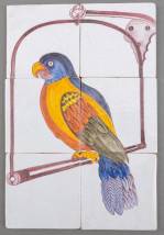 Zespas polychroom tegeltableau: papegaai op stok, 20e eeuw -tegels zijn als nieuw-, 13 x 13 cm