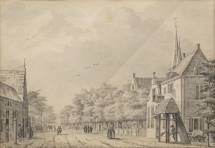 Theodorus 'Dirk' Verrijk (1734-1786), figuren op een weg met huizen en bomen, inkt op papier, l.o. gesigneerd -schuine vouw in papier-, 21 x 29,5 cm