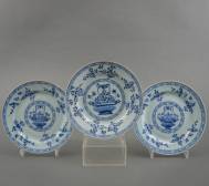Drie Chinees porseleinen borden met blauw-wit bloemenmanddecor, Qianlong -enkele kleine randchipjes-, Ø 21,5 cm