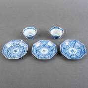 Paar Chinees porseleinen octagonale kommetjes en drie schoteltjes met blauw-wit lotusdecor, eerste helft 18e eeuw -defecten-, 3 x 6 x 6 cm