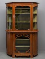 Mahonie vitrinekast met houtsnijwerk en gebogen glas aan de zijkanten, het interieur bekleed met groen velours, begin 20e eeuw -gebruikssporen-, 208 x 140 x 45 cm