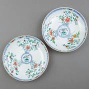Paar Chinees porseleinen schotels met blauw-witte decors: centraal een waaier op opgehoogde ziel, waaromheen bloemenvazen, Yongzheng, 5,25 x Ø 39,25 cm