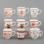 Negen diverse Chinees porseleinen kopjes met verschillende decors, 18e eeuw -defecten-, 7 x Ø 6 cm