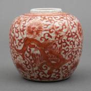 Chinees porseleinen gemberpot met ijzerrood floraal- en drakendecor op craquelé fond, gemerkt met artemisiablad, 20e eeuw, 13 x Ø 12 cm