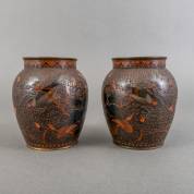 Paar Japanse koperen 'boombast' vaasjes met cloisonné decor van vinken, eerste helft 20e eeuw, 16 x Ø13 cm
