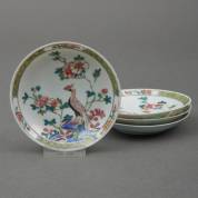 Vier Chinees porseleinen famille rose schoteltjes, Yongzheng-stijl, 20e eeuw -randschilfers-, 2 x Ø 10,5 cm