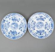 Paar Chinees porseleinen diepe borden met blauw-wit decor: visser aan de waterkant, Yongzheng/Qianlong -één bord met bodembarst-, 3,5 x Ø 23 cm