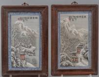 Paar Chinees porseleinen plaquettes met grisailledecor: besneeuwd landschap, 25 x 17 cm