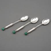 Drie zilveren theelepels met cilindervormige steel bekroond met groene bol, brutogewicht 49 gram, 12,5 x 2,5 x 1,2 cm