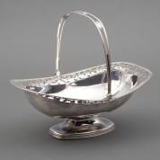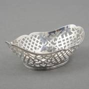 1e gehalte zilveren hengselmand met ajourgezaagde bloemenrand afgezet met kabelrand, meester: W.F. Schuss, Amsterdam, circa 1870, gewicht 698 gram -restauratie en deukjes-, 12 x 30 x 21 cm