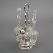 2e gehalte zilveren ménagèrestel, vermoedelijk meester: Gerrit Box, Amsterdam, 1863-1873, bestaande uit: fijn gegraveerde houder met twee gefacetteerde kristallen flessen, een gefacetteerde kristallen mosterdpot met 2e gehalte zilveren montuur, dop, en lepel, en een kristallen strooier met 2e gehalte zilveren dop, brutogewicht standaard 282 gram, 33 x 19 x 16 cm