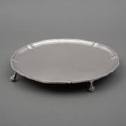 Rond 1e gehalte zilveren cabaret op vier klauwpootjes, gecontourneerd model afgezet met parelrand, Londen, 1816, gewicht 1191 gram, 4,5 x Ø 34 cm