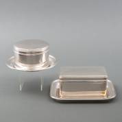 Ronde en rechthoekige 2e gehalte zilveren koektrommel, beide met onderschotel en geprofileerde randen, meester: Haarlemsche Zilversmederij K.H. Schermerhorn, Haarlem, 2001, gewicht 1509 gram, 7,5 x 15 x 10,5 cm