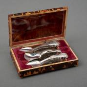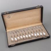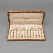 Twaalf 2e gehalte zilveren taartvorkjes in cassette, gewicht 86 gram, 11,5 cm