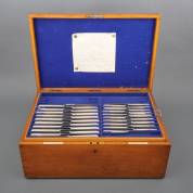 Houten bestekkist met vier etages, slot, en koperen beslag, waarin 1e gehalte zilveren bestek, spatelvormige steel met Haags lof, meester: Goldsmiths & Silversmiths Co. Ltd., Londen, 1902, bestaande uit: 24 dinervorken, 17 dinerlepels, 18 dinermessen, 18 dessertlepels, 17 dessertvorken, 18 dessertmessen, drie eilepeltjes, soepdienlepel, slacouvert, en twee sauslepels, daarbij: twaalf 2e gehalte zilveren oestervorkjes met palmetdecor en verzilverd diengerei, waaronder met parelmoeren heft, gewicht zonder messen en verzilverde delen 5544 gram, brutogewicht messen 2408 gram, 22 x 39 x 58 cm