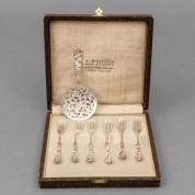 Serie van zes 2e gehalte zilveren taartvorkjes en bijbehorend petit-fourschepje, de stelen met opengewerkt bloemdecor, 1939, gewicht 103 gram, in cassette, 11 cm