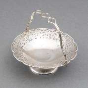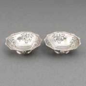 Paar 1e gehalte zilveren schaaltjes met ajourgezaagd decor, de gecontourneerde rand gedecoreerd met palmet en rocaille, meester: Mappin & Webb, Londen, 1940, gewicht 186 gram, 4 x Ø 12 cm