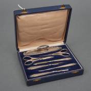 Zevendelige manicureset met 1e gehalte zilveren fijn gegraveerde monturen en greepjes, brutogewicht 152 gram, in cassette bekleed met blauw velours, 4,5 x 15 x 18 cm