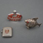 3e gehalte zilveren tondeldoosje met geëmailleerde appliqué met heraldische leeuw, porseleinen flesje met zilver bekleed, en BWZG strooier in de vorm van een vis, brutogewicht 75 gram, 6 x 4,5 x 1 cm