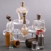 Zes kristallen parfumflacons, diverse modellen, waarvan vier stuks met 2e gehalte zilveren montuur en dop, twee binnenstopjes en twee foedralen aanwezig