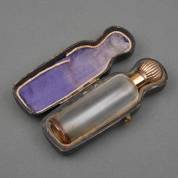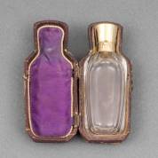 Kristallen parfumflacon met 14kt gouden dop, in foedraal -kleine beschadiging aan kristallen hals, zonder binnenstopje-, herkomst: nalatenschap oud-antiquair Zeist, 10 x 4 cm