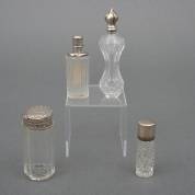 Drie kristallen parfumflacons met 1e en 2e gehalte zilveren monturen en doppen, daarbij: glazen flacon met 1e gehalte zilveren schroefdop -gebruikssporen-, 9 x 4 cm