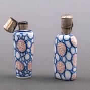 Paar rood-blauw-wit porseleinen parfumflacons met 2e gehalte zilveren montuur en dop, één binnenstopje aanwezig -één montuur defect-