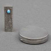 3e gehalte zilveren lippenstifthouder met gegraveerd bloemdecor, met spiegeltje en blauw sluitknopje, daarbij: 3e gehalte zilveren poederdoosje met geguillocheerd decor en spiegeltje -gebruikssporen-, brutogewicht 70 gram
