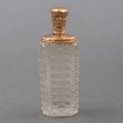 Kristallen parfumflacon met 14kt gouden montuur en dop met gegraveerd motief, glazen binnenstopje aanwezig -dop gedeukt-, 9 x 3,5 x 2,5 cm