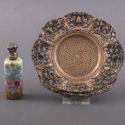 BWZG Djokja schaaltje met opengewerkte rand en hengsel, gewicht 148 gram daarbij: parfumflacon met 2e gehalte zilveren dop -dop defect-