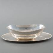 2e gehalte zilveren saucière, glad model afgezet met parelrand, op losse onderschotel, Indonesië, 20e eeuw, gewicht 539 gram, 24 x 14,5 cm