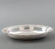Ovaal gecontourneerde 2e gehalte zilveren schaal, afgezet met parelrand, Indonesië, 20e eeuw, gewicht 651 gram, 4,5 x 31 x 23,5 cm
