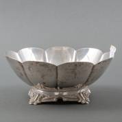 Gelobde 2e gehalte zilveren koekjesschaal op bladgedecoreerde standring, gewicht 420 gram, 8,5 x Ø 21 cm