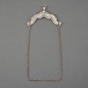 2e gehalte zilveren tasbeugel met binnenbeugel aan gegraveerde jasseron schakelketting, meester: Jan Peereboom, Zwolle, 1733, gewicht 251 gram, 16 x 7 x 1 cm