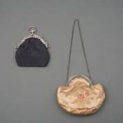 Twee damestasjes één zwart met BWZG tasbeugel, de ander geborduurd satijn met 2e gehalte zilveren tasbeugel met ketting, brutogewicht 168 gram, 35 x 14 x 4 cm