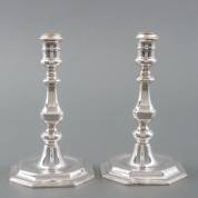Paar 2e gehalte zilveren tafelkandelaars staand op octagonale voet, naar antiek voorbeeld, meester: J. Gelderblom, Schoonhoven, 2002, gewicht 766 gram, 18,5 x 11 x 11 cm