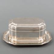 2e gehalte zilveren koektrommel op onderschotel, kardinaalsmodel, meester: Zilverfabriek Voorschoten, 1950, gewicht zilver 730 gram, 15,5 x 20 cm
