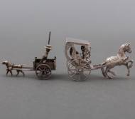 Twee 2e gehalte zilveren miniaturen: koets en hondenkar, 19e/20e eeuw, gewicht 57 gram, 4 x 7 x 3 cm