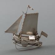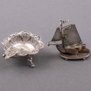 Klein 3e gehalte zilveren asbakje gemaakt van 1000 reis-munt, Brazilië, 1860, daarbij: 2e gehalte zilveren miniatuur: zeilboot, meester: J. Verhoogt, Hoorn, begin 20e eeuw, gewicht 42 gram