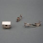 Drie 2e gehalte zilveren miniaturen: paardenslee, handkar met zuurton, en circuswagen, gewicht 73 gram -defecten-, 4 x 4 x 2,5 cm