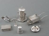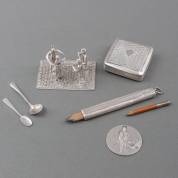 Zes zilveren miniaturen en zilveren vingerhoedje, diverse gehaltes, meester doofpot: J. Mes, Hoorn, gewicht 66 gram