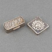 1e gehalte zilveren postzegelhouder met geciseleerde zon, en BWZG (750/1000) pillendoosje met gedreven mythologisch decor, gewicht 30 gram, 3 x 3 cm