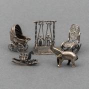Vijf zilveren miniaturen, diverse gehaltes: filigrain schommelstoel, hobbelpaard, kinderwagen, schommel, en olifantje, gewicht 54 gram, 4,75 cm