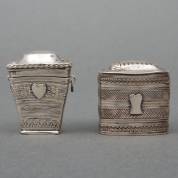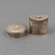 Twee 2e gehalte zilveren lodereindoosjes, met bandgraveringen, exemplaar met hartvormige appliqué heeft meester: Dirk Hendrik Greup Sr., Schoonhoven, circa 1850, exemplaar met 5-centhanger heeft meester: Pieter Lobensteijn, Schoonhoven, 1837-1859, gewicht 38 gram -defecten-, 3,5 x 4 x 2,5 cm
