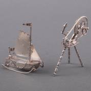 Twee 2e gehalte zilveren miniaturen: schommelscheepje -schommel verbogen- en spinnewiel, 19e/20e eeuw, gewicht 34 gram