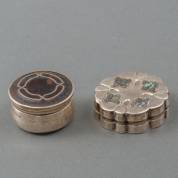 Twee 1e gehalte zilveren lodereindoosjes, de één met schildpad deksel, meester Levi & Salaman, Birmingham, 1906, de ander met een parelmoer ingelegd deksel, brutogewicht 41 gram, Ø 4,5 cm