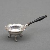 Zilveren miniatuur: pijpkomfoor met gecontourneerde bak op drie krulpootjes met gezwart houten steel, onderzijde gemonogrammeerd, meester: Johannes Adrianus van Geffen, Amsterdam, 1780, brutogewicht 16 gram, 9,5 x 2,5 x 4 cm