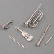 Vijf 1e en 2e gehalte zilveren miniatuur muziekinstrumenten: trompet, viool met strijkstok, klarinet, hoorn, en blokfluit aan hangoog, deels Italië, gewicht 72 gram, 8 x 3.5 cm
